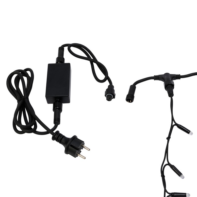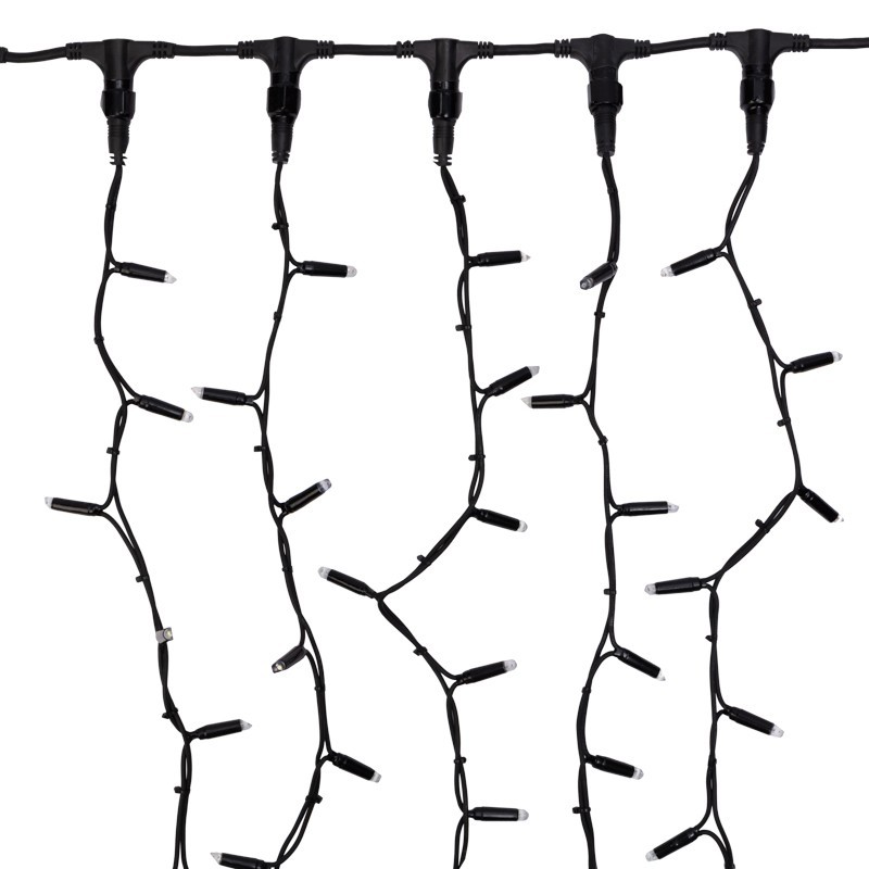 Гирлянда "Светодиодный Дождь" представляет собой гибкий горизонтальный шнур-шину (2м), к которому через определенные промежутки крепятся вертикальные нити (20 шт.) со светодиодными лампами, которые отличаются от «Бахромы» тем, что имеют одинаковую, достаточно значительную длину, часто превышающую протяженность шины. На концах каждой шины есть разъем и штепсель, которые предназначены для последовательного соединения нескольких световых дождей в большой занавес ПЛЕЙ-ЛАЙТ. Используя занавес, можно не только создавать красивые световые занавесы или оформлять различные плоскости, например, фасады домов, окна и т.д., но и украшать объемные объекты.