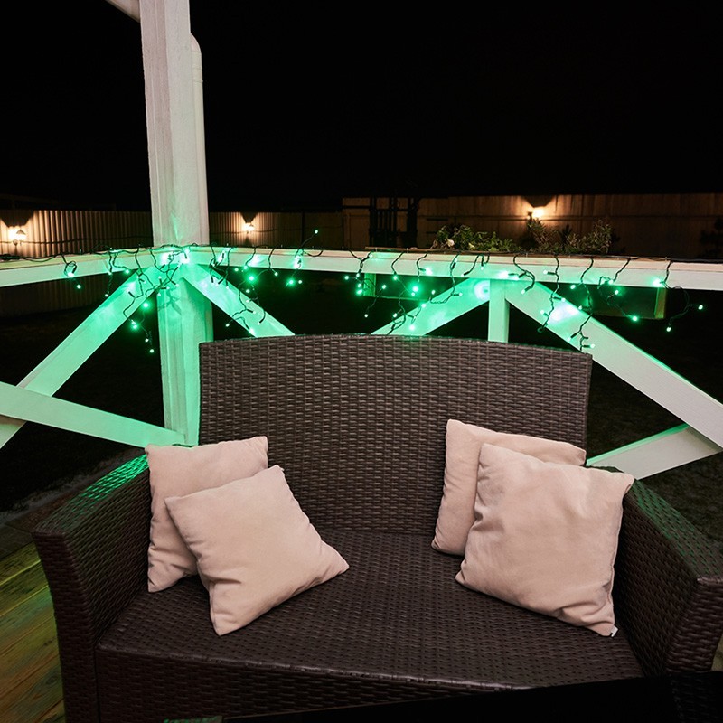 Гирлянда имеет зеленый цвет свечения и предназначена для использования как внутри помещений, так и снаружи.